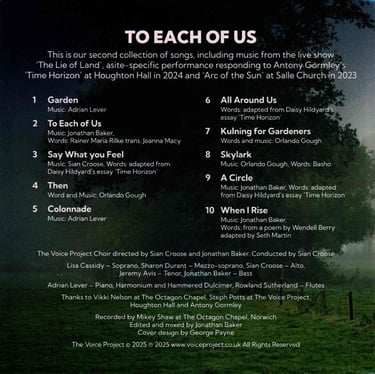 Over 8 weeks of rehearsals, in Norwich and Brighton, we rehearsed the songs and honed our sound as a group. In March, the choir gathered at the Octagon Chapel in Norwich for a recording session. They were joined by soloists Jeremy Avis, Lisa Cassidy and Sharon Durant, as well as Voice Project co-directors Jon Baker and Sian Croose, and instrumentalists Adrian Lever and Rowland Sutherland.